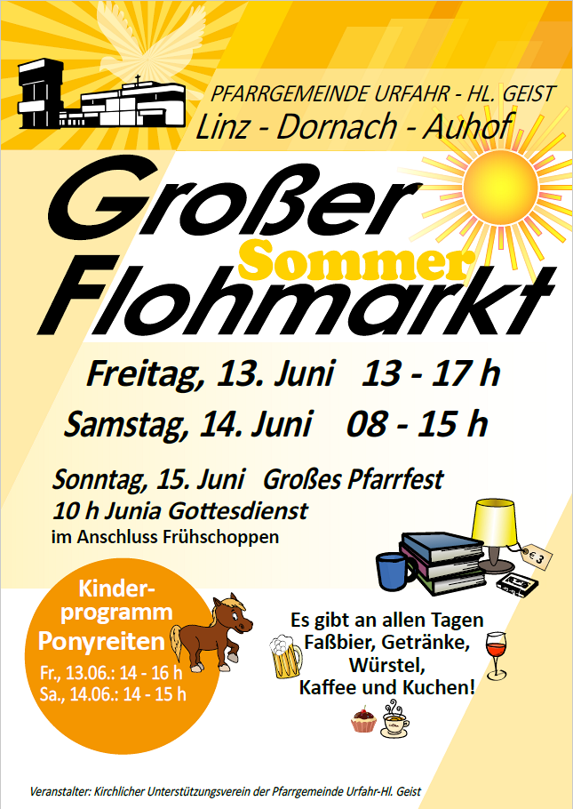Großer Sommerflohmarkt & Junia Fest Freitag, 13.Juni 13 - 17 Uhr Samstag, 14.Juni 08 - 15 Uhr Sonntag, 15.Juni Großes Junia Pfarrfest (10h Gottesdienst, dann Frühschoppen)